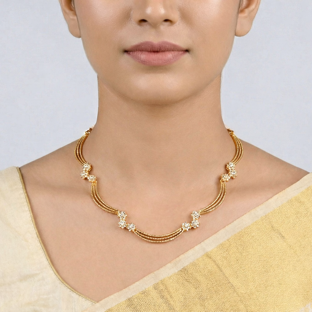 Elegant Gold-Plated Triple-Strand Floral Motif Necklace