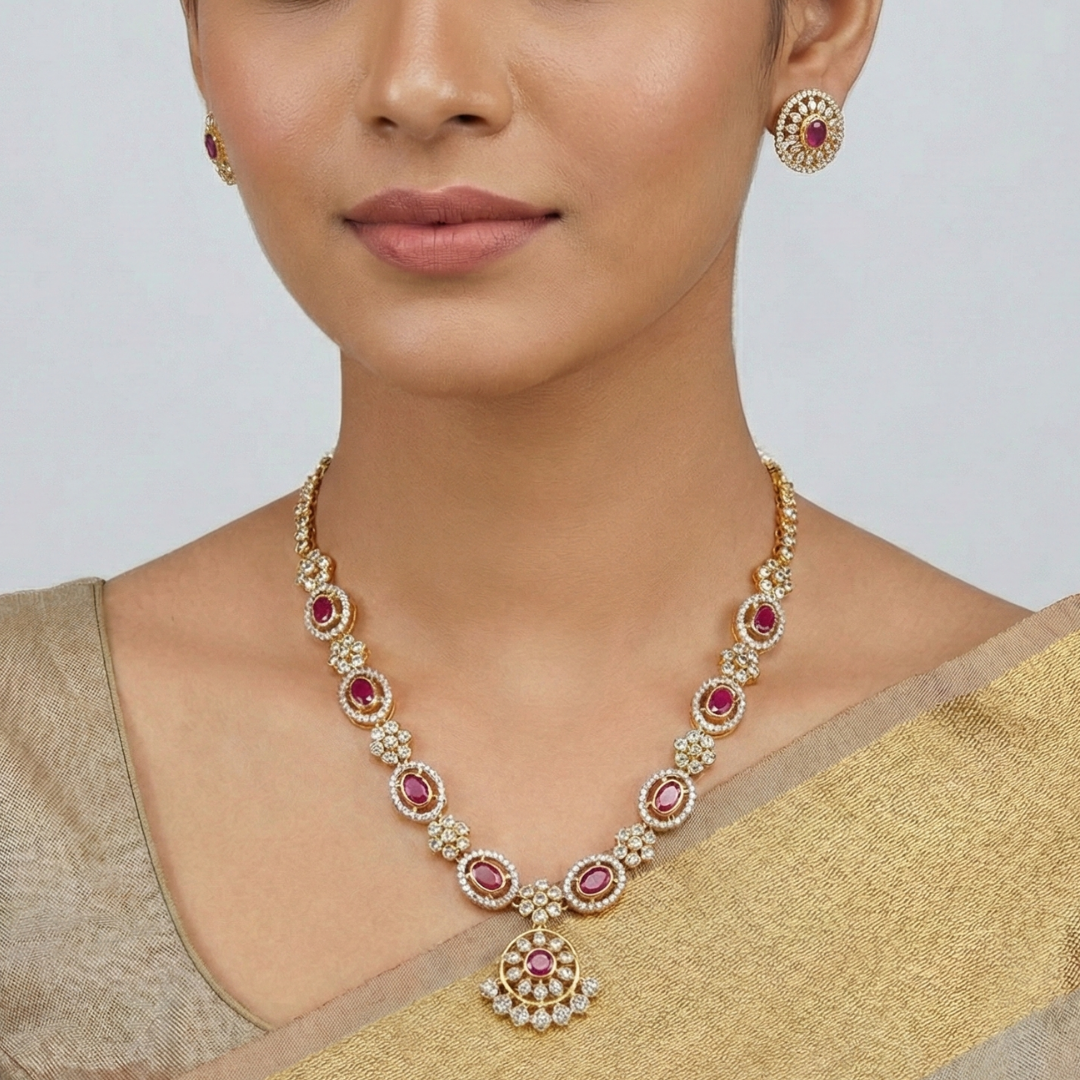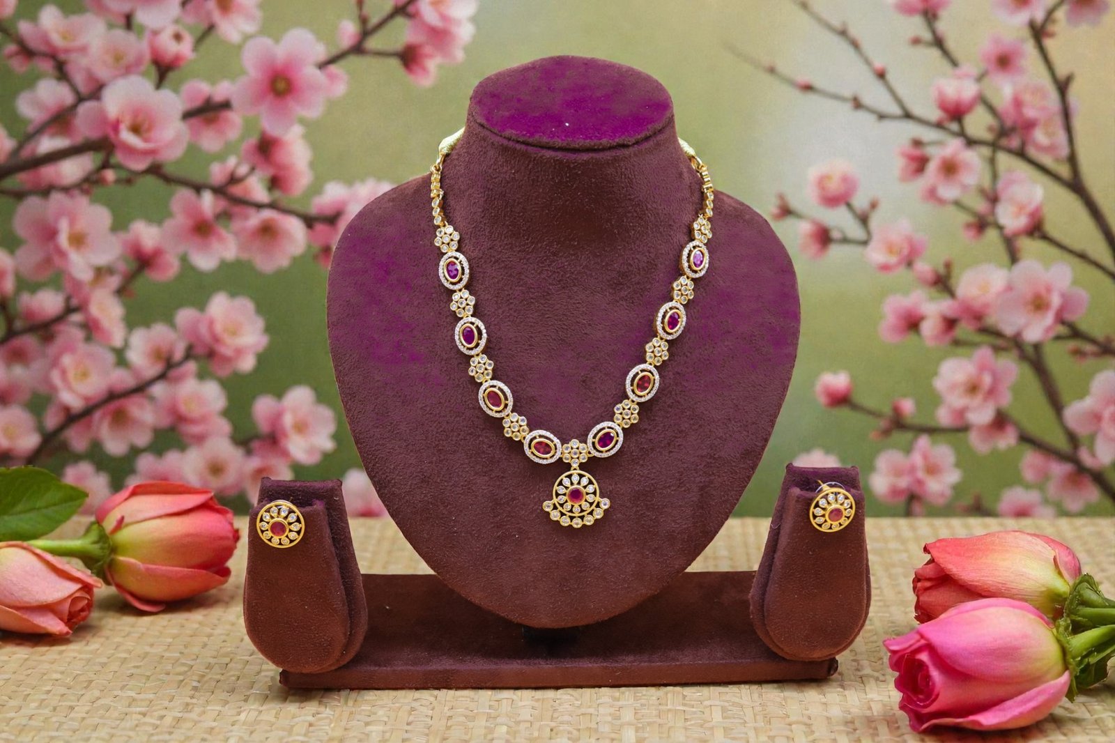 Elegant Ruby & Cubic Zirconia Floral Gold-Plated Necklace Set