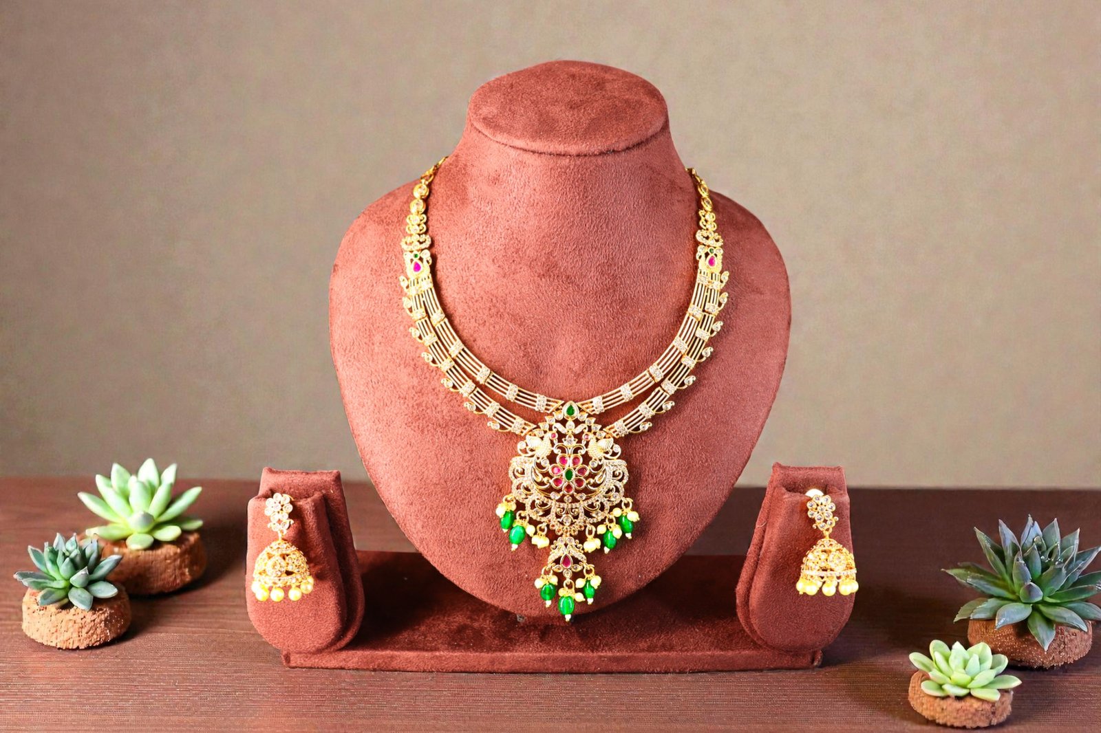 Majestic Heritage Gold-Plated Matte Finish Necklace Set with Jhumka Earrings