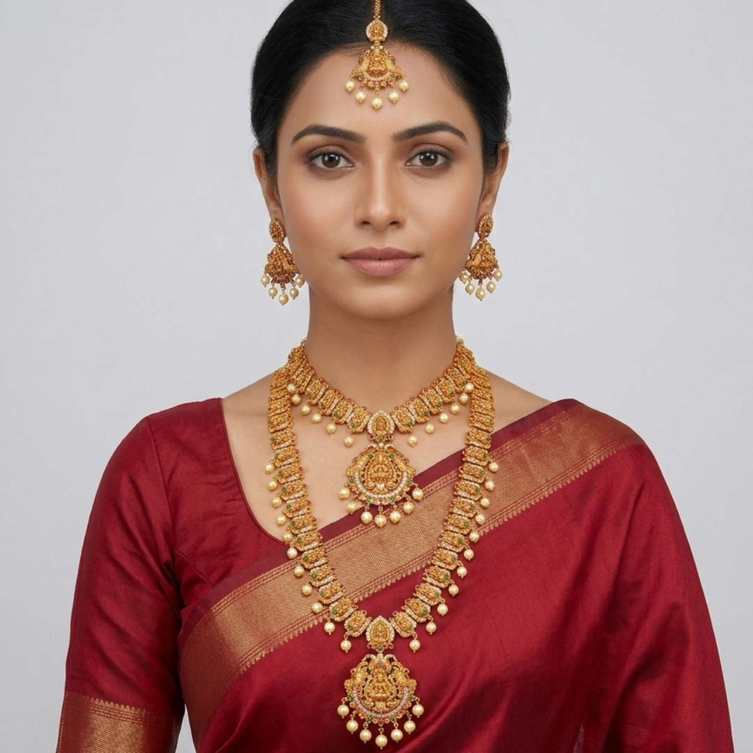 Traditional Gold-Plated Temple Jewelry Set with Lakshmi Motifs – 5-Piece Bridal Collection
